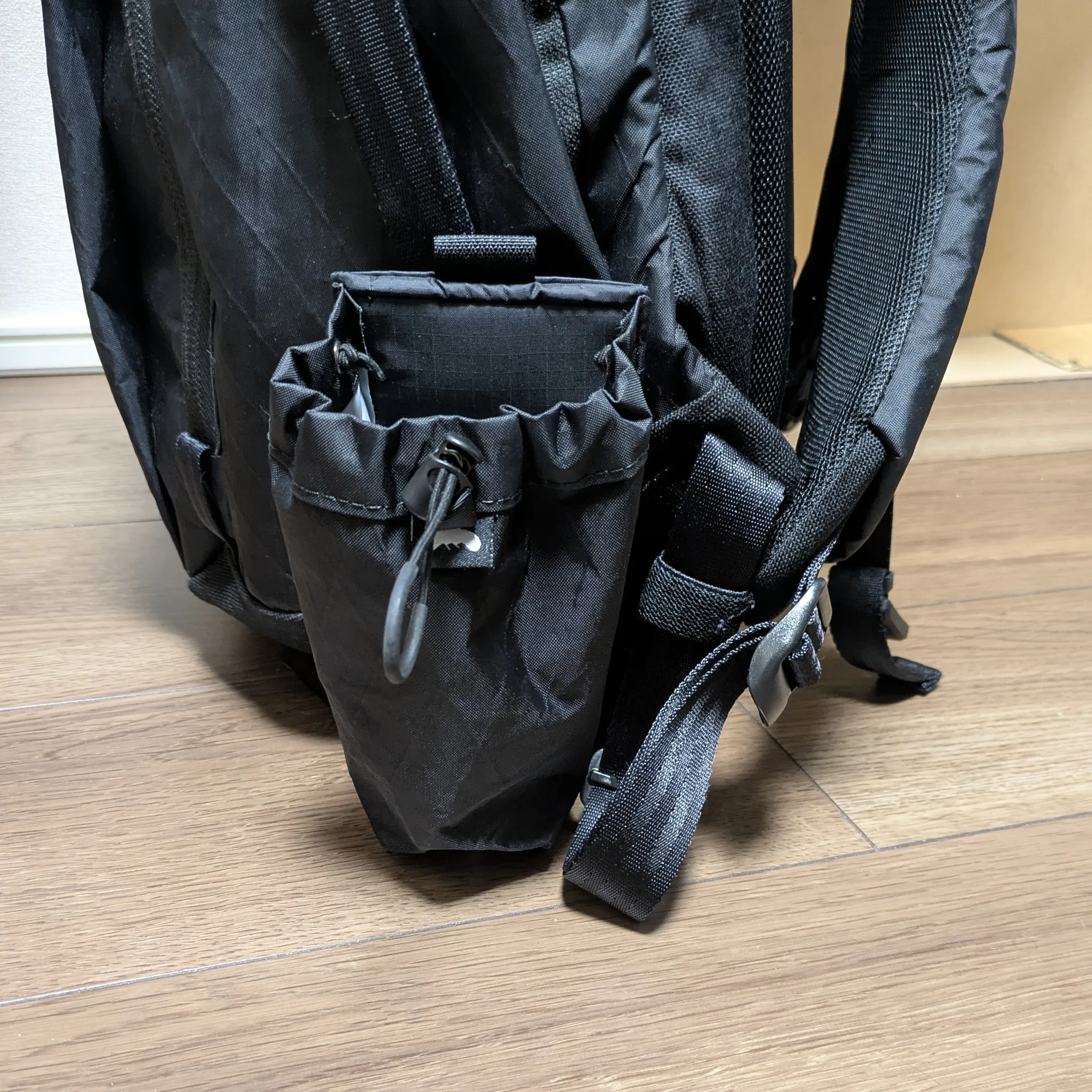 OGAWANDの外付けボトルホルダーを買って付けた。 生地がバックパック本体と同じ(X-Pac)モデルがあったのでそれにした。