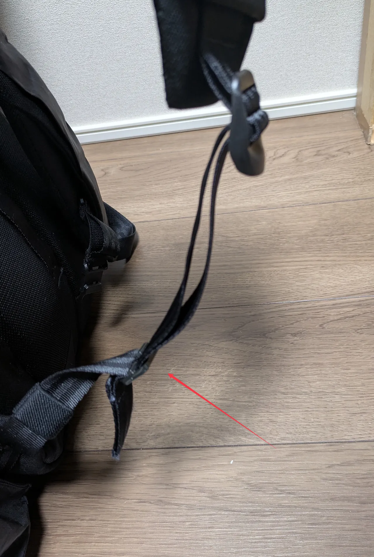 Max EDCを含むAble CarryのバックパックはAフレームという構造を採用していて、底面までストラップが張ってある。 本来の目的は背負い心地の向上だが、これを利用して底面にクリップを挟んで自立させることにした。